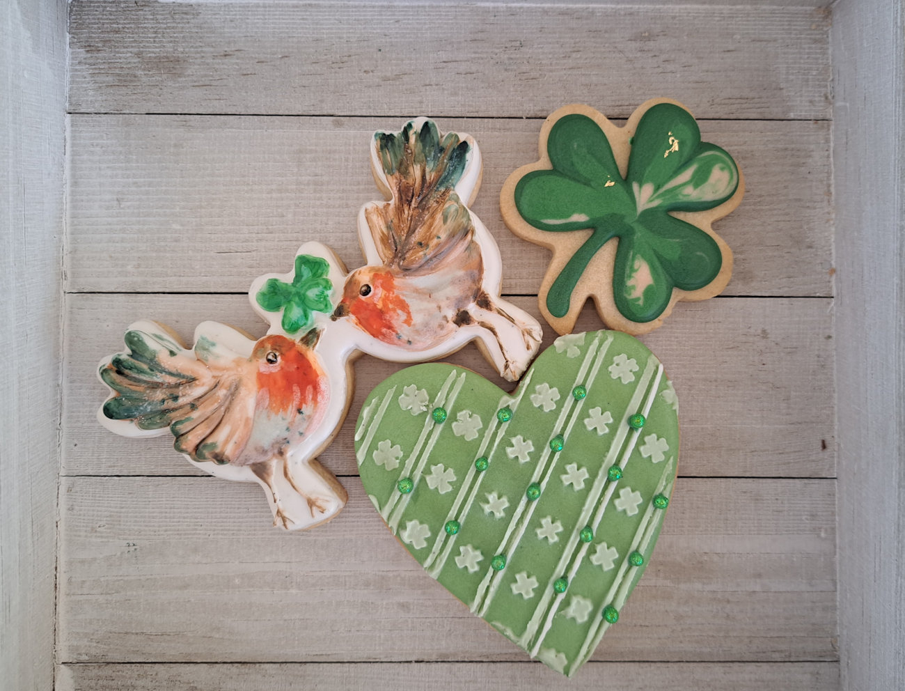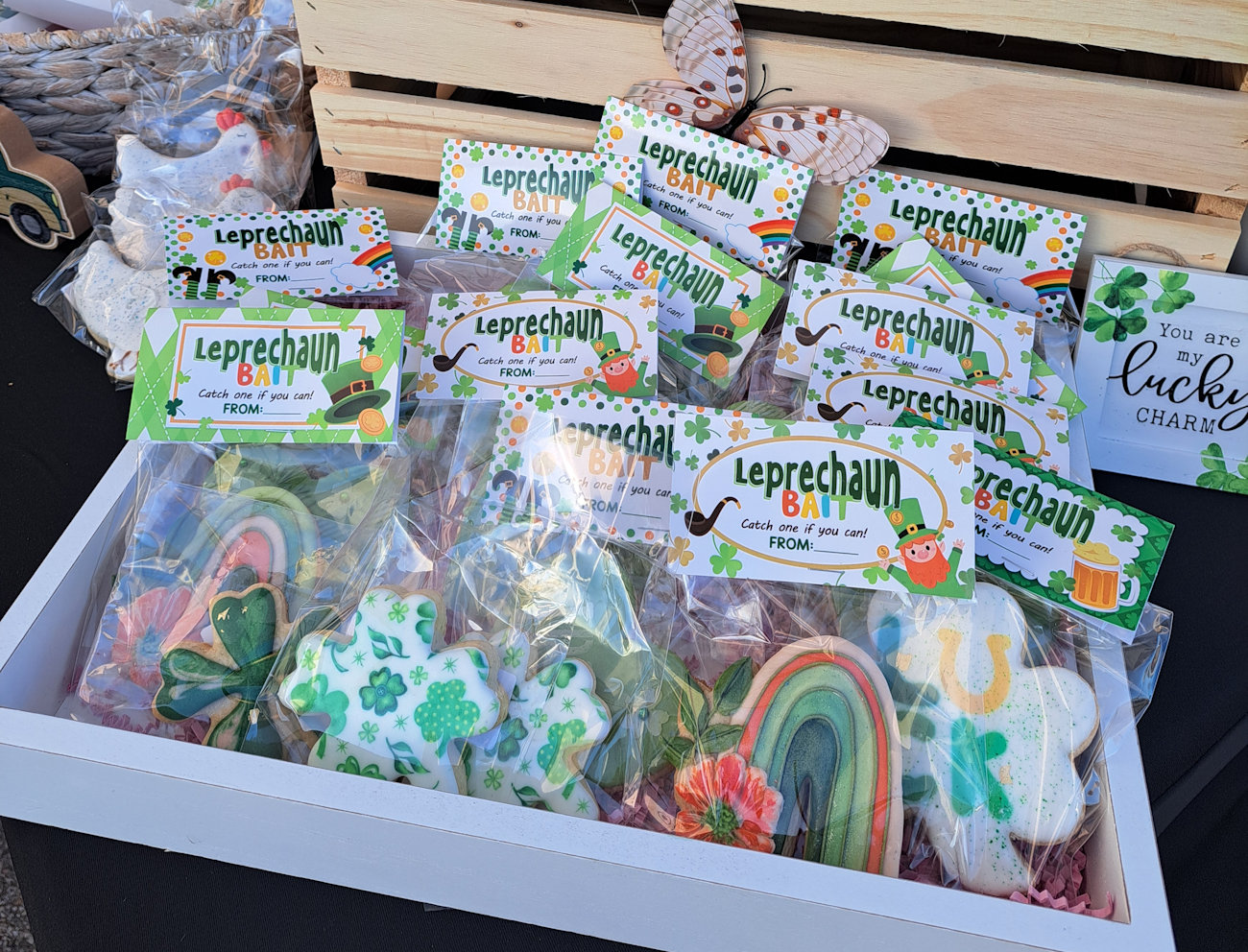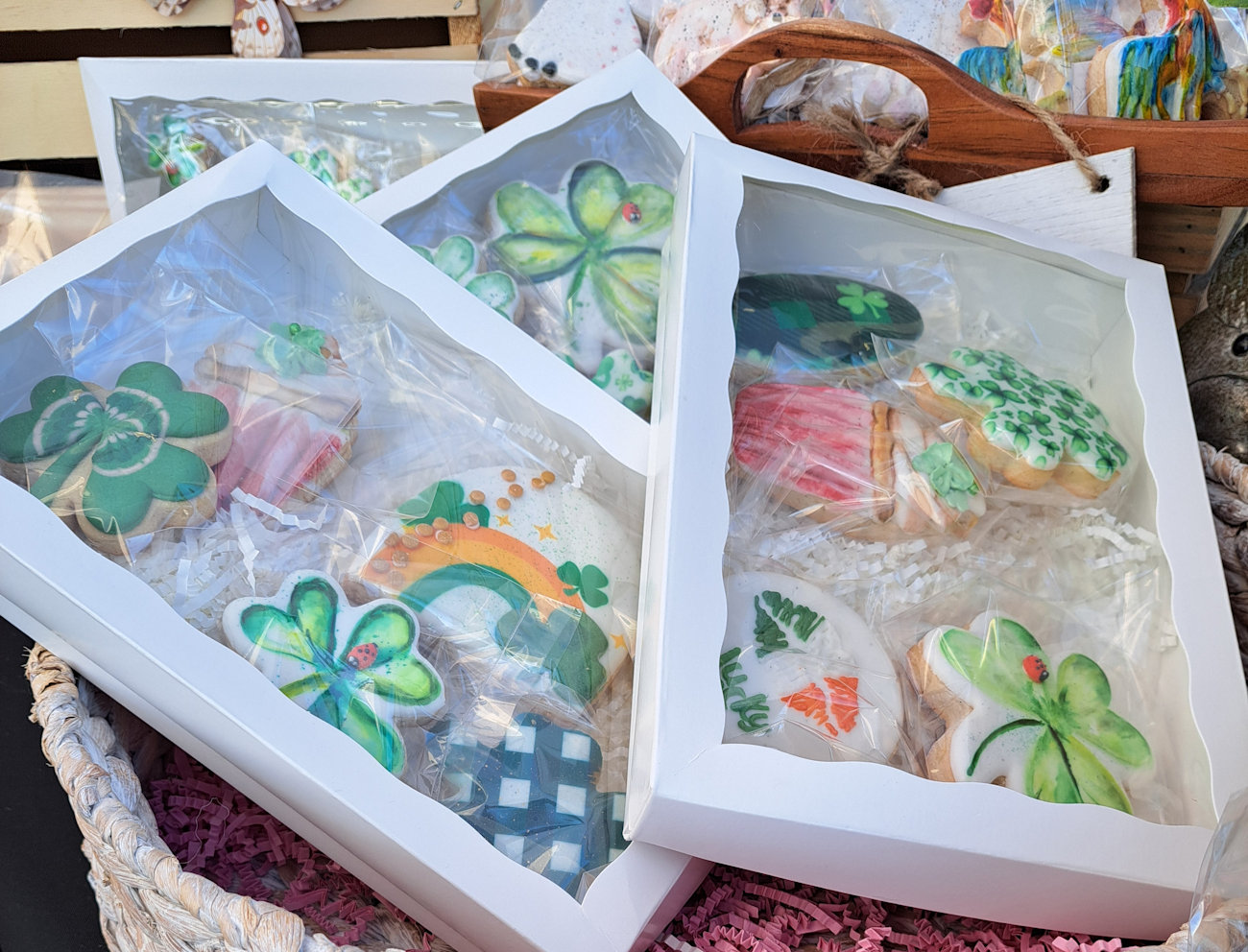 Celebrate St. Patrick’s Day with Emerald Luck cookies—this very green assortment of sugar cookies features whimsical shamrocks, four-leaf clovers, leprechauns, pots of gold, and colorful rainbows. In addition to these traditional designs, I offer unique options like hand-painted clovers with delicate veins and ladybugs—for that extra touch of luck, of course! These sets also feature a variety of fun and festive sayings to add a joyful flair to your celebrations.